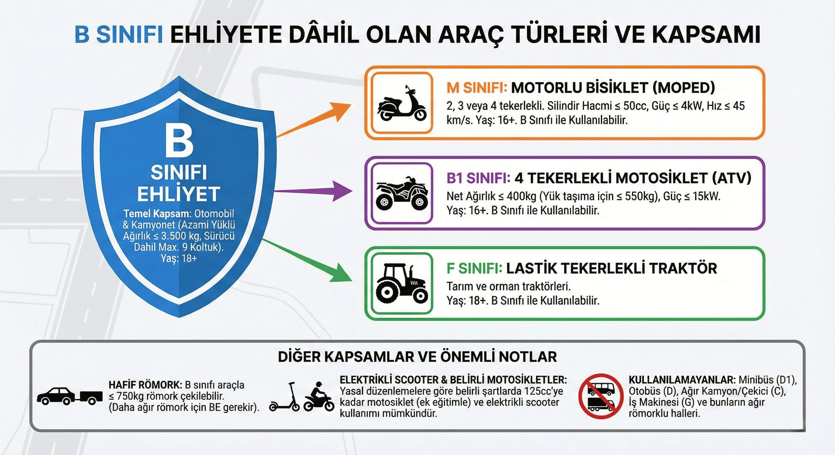 B sınıfı ehliyete sahip olan sürücüler, yalnızca otomobil ve hafif ticari araçları değil, aynı zamanda bazı diğer sınıflardaki araçları da kullanma hakkına sahiptir. Bu kapsamda M, B1 ve F sınıfı araçlar da yer alır. Yönetmelik gereği, B sınıfı sürücü belgesi olan biri ek bir belgeye ihtiyaç duymadan bu üç araç türünü de trafikte kullanabilir. Ancak bu yetkinin geçerli olması için ehliyetin geçerli ve aktif durumda olması gerekir.