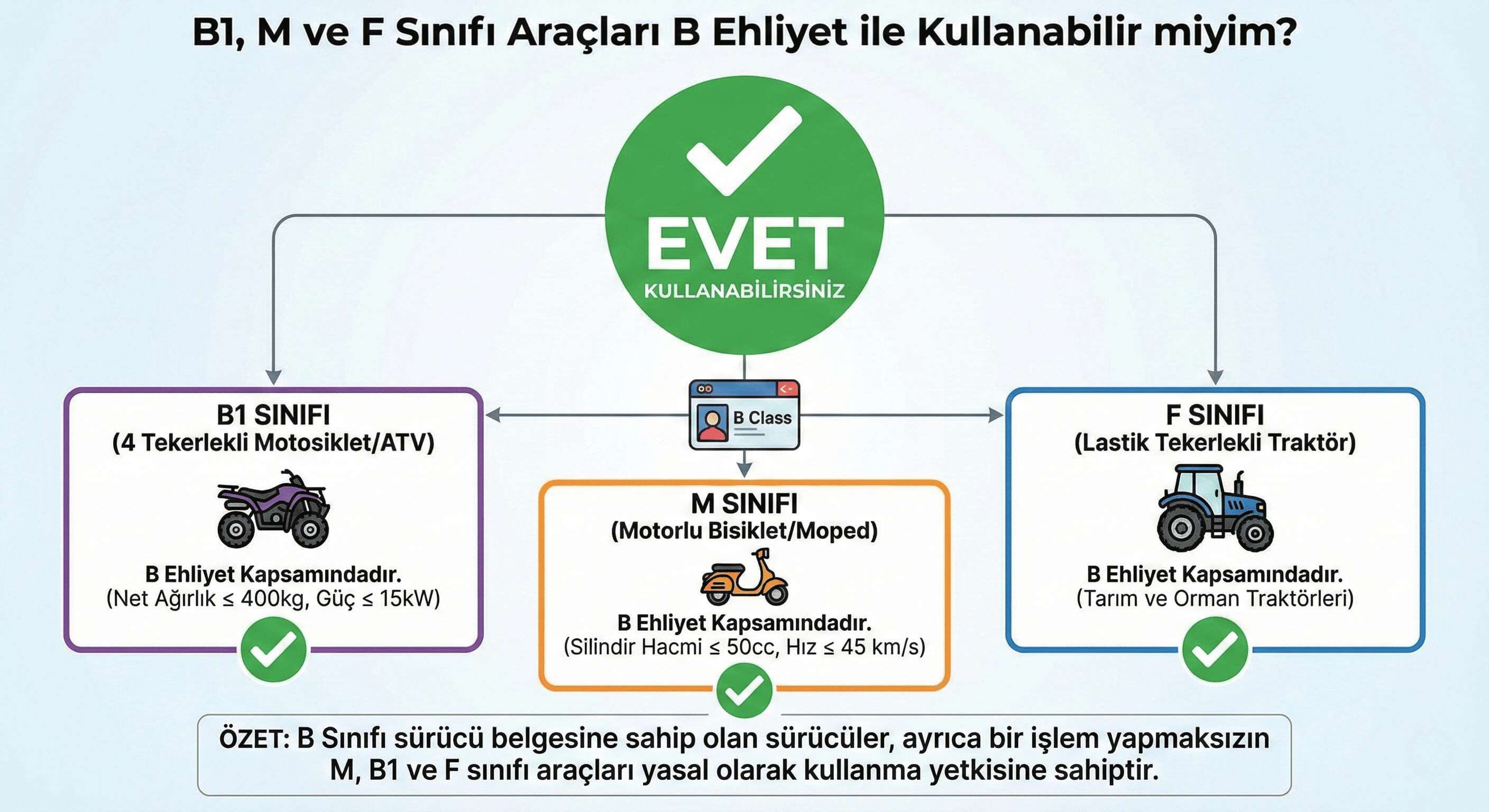 B1, M ve F Sınıfı Araçları B Ehliyet ile Kullanabilir miyim?