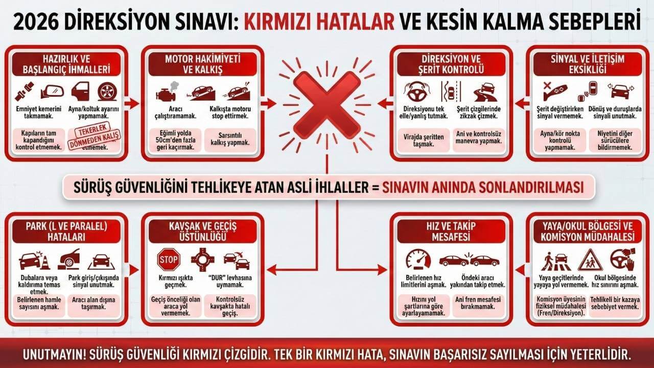 2026 yılı yönetmeliğine göre kırmızı hata olarak nitelendirilen kusurlar, sürüş güvenliğini doğrudan tehlikeye atan ve sınavın o saniye sonlandırılmasına neden olan asli ihlallerdir. Emniyet kemerini takmamak, kırmızı ışıkta geçmek, yaya geçitlerinde yayalara yol vermemek veya komisyon üyesinin müdahalesini gerektirecek kadar tehlikeli araç kullanmak kesin kalma sebeplerinin başında gelir. Adayın sürüşe başlamadan önce ayna, koltuk veya direksiyon ayarlarını kontrol etmemesi dahi trafiğe çıkmaya hazır olunmadığının bir göstergesi kabul edilir ve sınav başarısız sayılır.