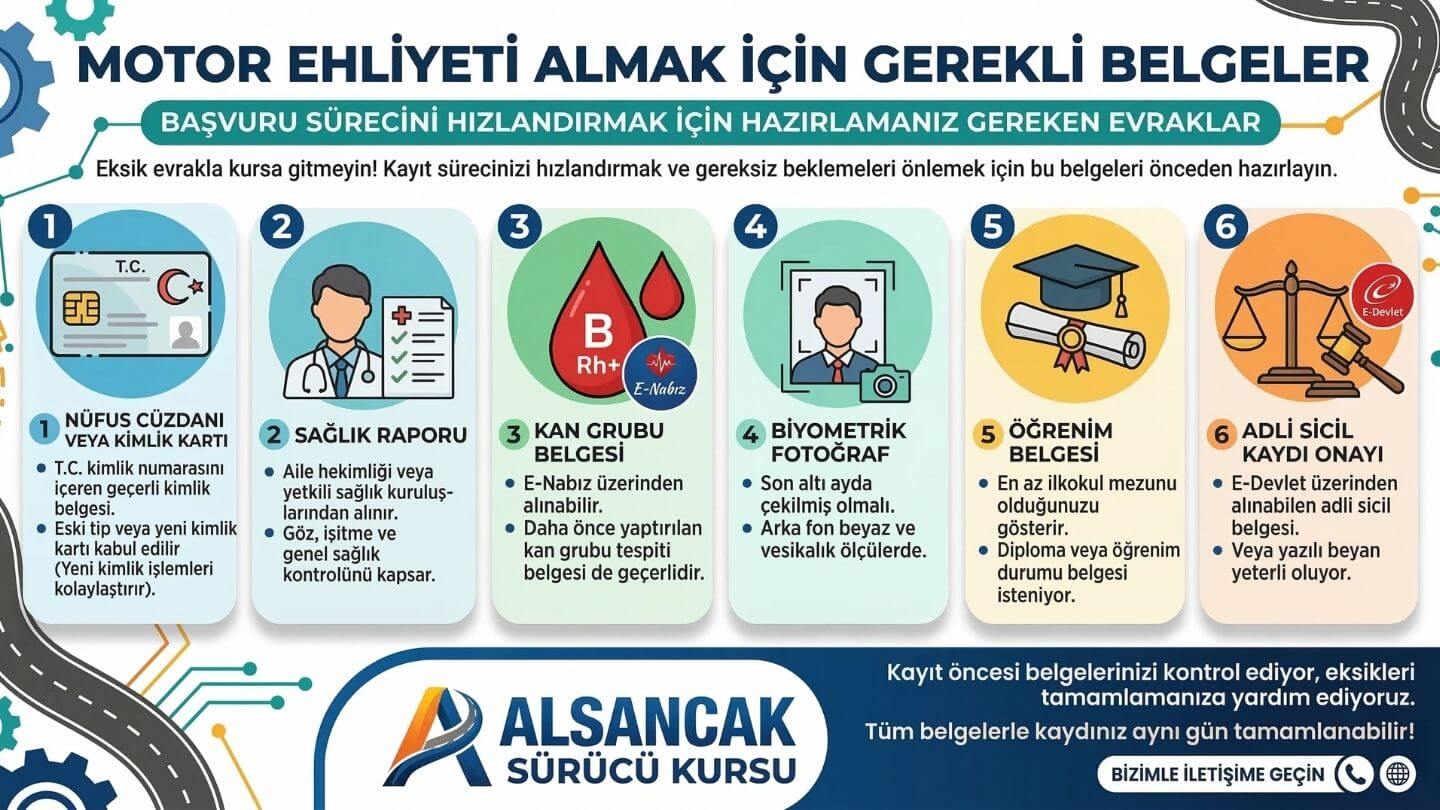 Motor ehliyeti başvurusu yapmadan önce bazı evrakları tamamlamanız gerekiyor. Bu belgeleri önceden hazırlamak, kayıt sürecini hızlandırır ve gereksiz beklemelerin önüne geçer. Eksik evrakla kursa gittiğinizde işlemler uzayabileceğinden, aşağıdaki listeyi kontrol ederek gelmeniz en pratik yol olacaktır.