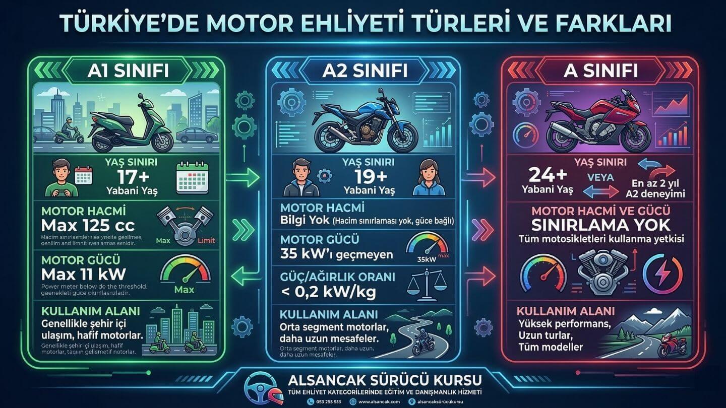 Türkiye'de motosiklet kullanmak için alınabilecek üç farklı ehliyet sınıfı bulunuyor: A1, A2 ve A. Bu sınıflar arasındaki temel ayrım, kullanılacak motosikletin motor hacmi ve güç kapasitesiyle doğrudan ilişkili. Yaş faktörü de hangi ehliyeti alabileceğinizi belirleyen önemli kriterlerden biri. Doğru ehliyet sınıfını seçmek hem yasal zorunluluk hem de güvenli sürüş açısından kritik bir adım.
