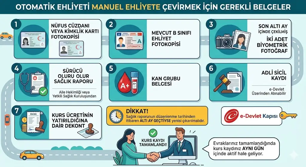 Otomatik vites sınıfında alınan B sınıfı ehliyet, manuel araç kullanma yetkisi vermez. Bu kısıtlamayı kaldırmak için sürücü kursuna kayıt yaptırmanız, direksiyon eğitimi almanız ve manuel vites aracıyla direksiyon sınavına girmeniz gerekir. Sınav başarılı geçildiğinde ehliyetinizdeki otomatik vites kısıtlaması kaldırılır ve her iki tip aracı da yasal olarak kullanabilirsiniz. Süreç ortalama iki ila dört hafta içinde tamamlanabilir.