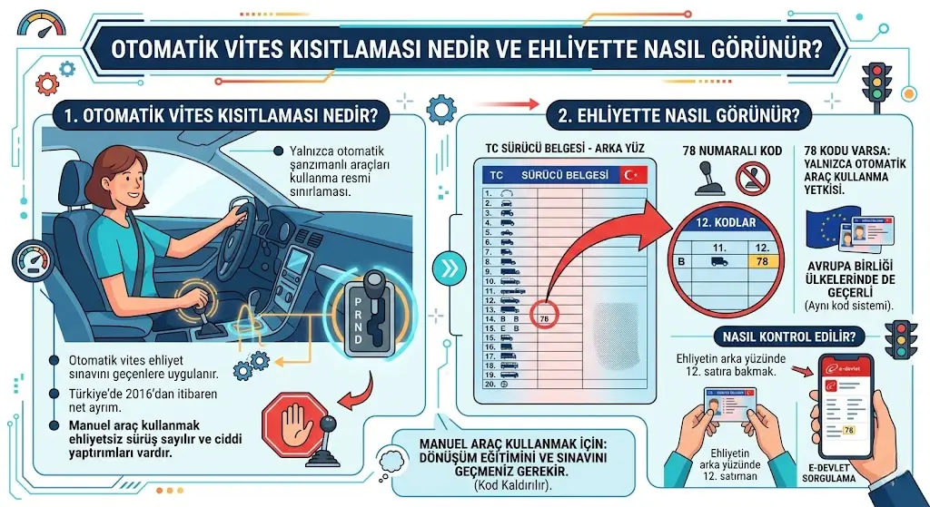 Türkiye'de ehliyet sistemi 2016 yılından bu yana otomatik ve manuel vites ayrımını net biçimde yapıyor. Otomatik vitesle sınav veren adayların ehliyetine özel bir kod işleniyor. Bu kod, sürücünün yalnızca otomatik şanzımanlı araçları kullanabileceğini belirtiyor. Trafik denetimlerinde manuel araç kullanırken yakalanmak, ehliyetsiz araç kullanma kapsamında değerlendiriliyor. Bu nedenle dönüşüm işlemi hem yasal zorunluluk hem de güvenlik açısından önem taşıyor.