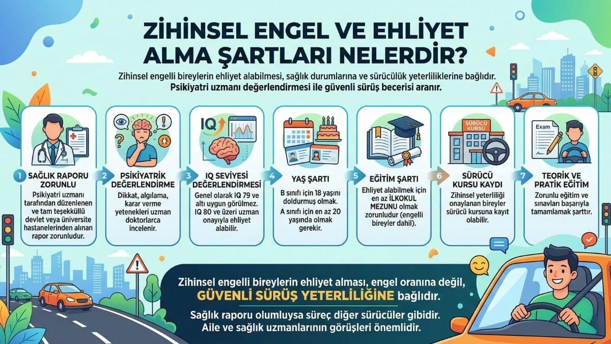 Zihinsel engelli bireylerin ehliyet alabilmesi, sağlık durumlarına ve uzman değerlendirmelerine bağlıdır. IQ düzeyi 79 ve altı olan bireyler için ehliyet verilmemektedir. Ancak, IQ düzeyi 80 ve üzeri olan bireyler, psikiyatri uzmanının “sürücü olabilir” raporu vermesi durumunda ehliyet alabilirler.