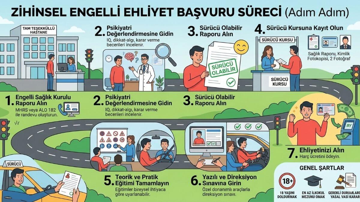 Engelli bireylerin ehliyet alabilmesi için, öncelikle bir sağlık kuruluşundan “sürücü olabilir” ibaresi bulunan bir sağlık raporu almaları gerekmektedir. Bu rapor, kişinin araç kullanma yetkinliğini değerlendiren uzman doktorlar tarafından verilir. Zihinsel engeli olan bireyler için bu değerlendirme, genellikle bir psikiyatri uzmanı tarafından yapılır. Eğer uzman doktor, bireyin araç kullanmasının güvenli olduğunu belirlerse, ehliyet almasına izin verilebilir.